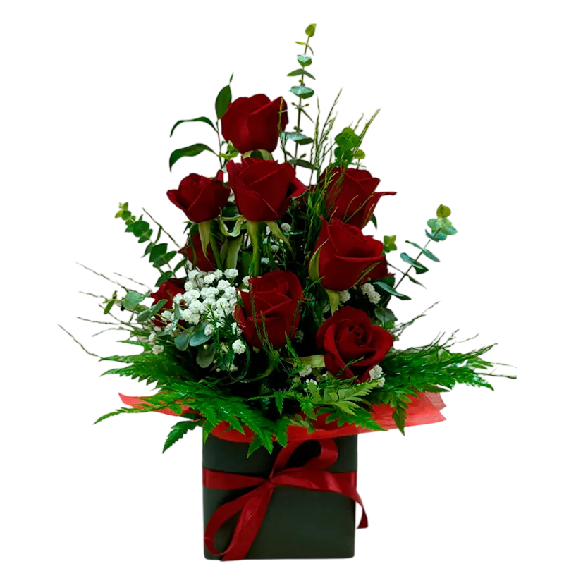 Sofisticado arreglo de rosas rojas en base ecológica, una creación elegante que transmite pasión, lujo y distinción.