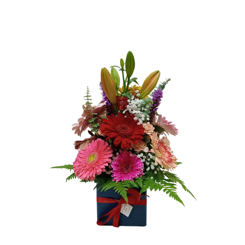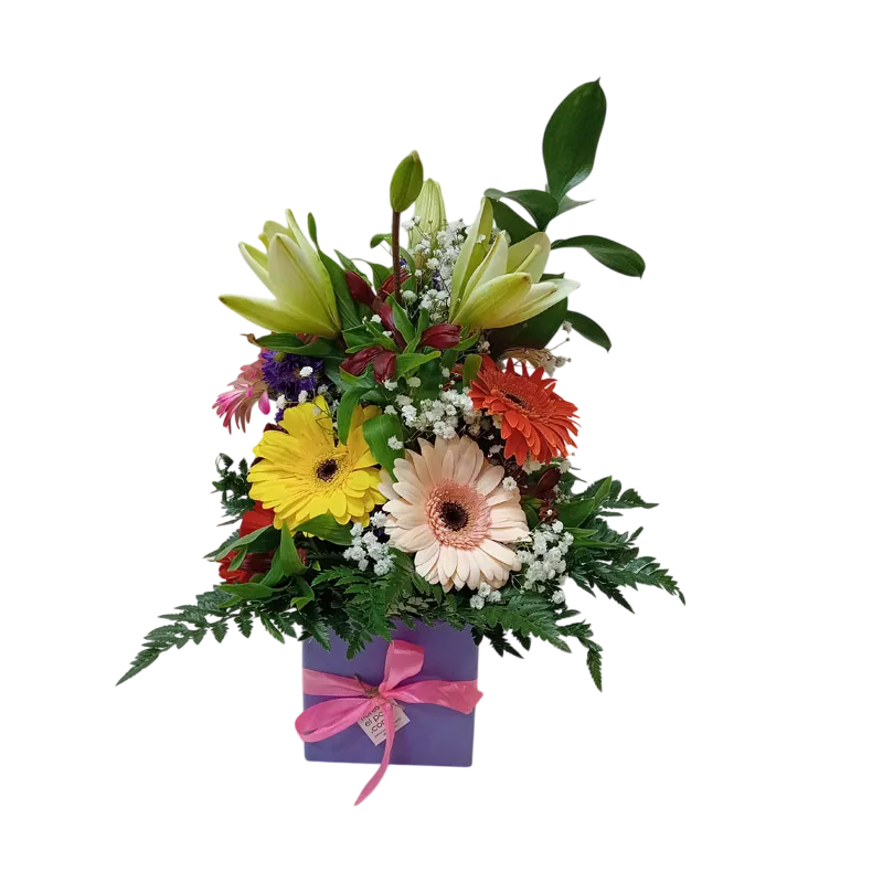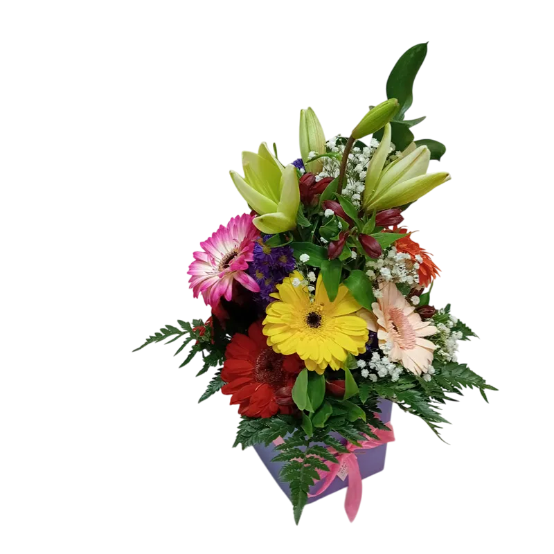 Deleita tus sentidos con este vibrante arreglo floral de liliums y gerberas, cuidadosamente presentado en una elegante base cuadrada reciclada. Un regalo perfecto para cualquier ocasión o simplemente para decorar tu hogar con un toque de naturaleza.