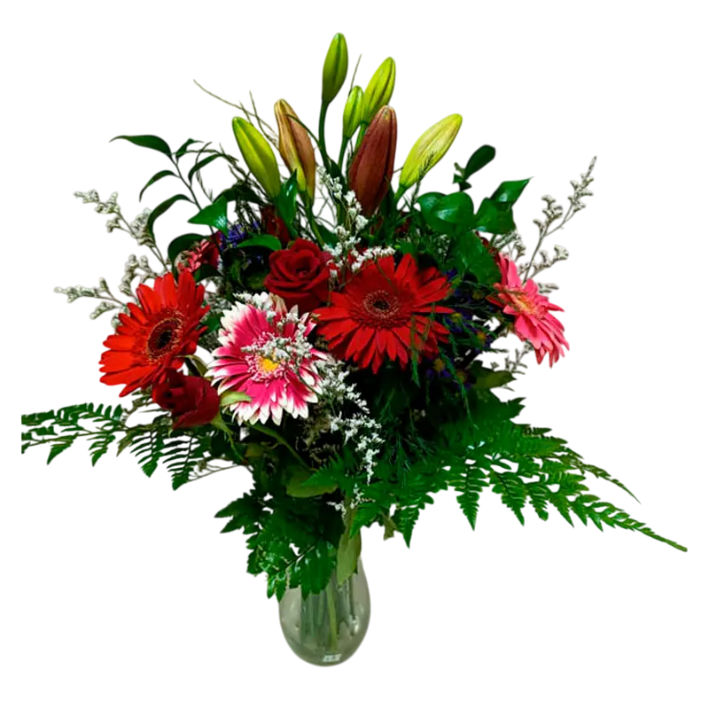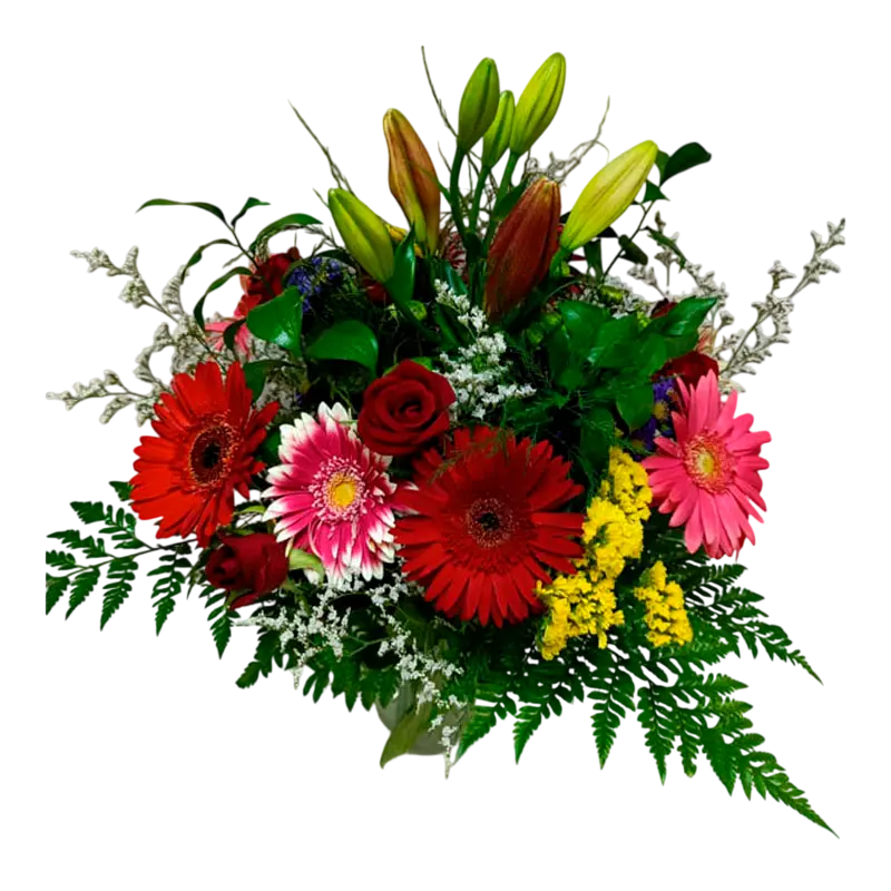 Ramo Primavera colorido con gerberas, rosas, lirios en botón y follaje variado; un arreglo alegre y fresco para cualquier celebración.